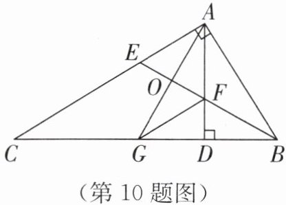 10. 如图,在$\triangle ABC$中,$\angle BAC=90^{\circ}$,高$AD$与角平分线$BE$相交于点$F$,$\angle DAC$的平分线$AG$分别交$BC$,$BE$于点$G$,$O$,连接$FG$,下列结论:①$\angle C=\angle EBG$;②$\angle AEF=\angle AFE$;③$AG\perp EF$;④$S_{\triangle ACD}=S_{\triangle ABG}$,其中所有正确结论的序号是(