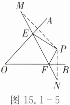 7. 如图 15.1 - 5,P 在∠AOB 内,点 M,N 分别是点 P 关于 AO,BO 的对称点,MN 分别交 OA,OB 于 E,F.
