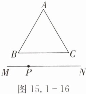 7. 如图 15.1 - 16,△ABC 是等边三角形,直线 MN//BC,点 P 在直线 MN 上运动,当点 P 与△ABC 的两个顶点的距离相等时,警报器就会发出警报,则在直线 MN 上会发出警报的点有(