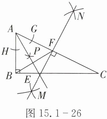 9. 如图 15.1 - 26,Rt△ABC 中,∠ABC = 90°,AE = 2BE 分别以顶点 A,C 为圆心,大于 $\frac{1}{2}AC$ 的长为半径画弧,两弧分别相交于点 M 和点 N,作直线 MN 分别与 BC,AC 交于点 E 和点 F;以点 A 为圆心,任意长为半径画弧,分别交 AB,AC 于点 H 和点 G,再分别以点 H,点 G 为圆心,大于 $\frac{1}{2}HG$ 的长为半径画弧,两弧交于点 P,作射线 AP,若射线 AP 恰好经过点 E,则下列四个结论:①∠C = 30°;②AP 垂直平分线段 BF;③CE = 2BE;④$S_{△BEF} = \frac{1}{6}S_{△ABC}$.其中,正确结论的个数有(