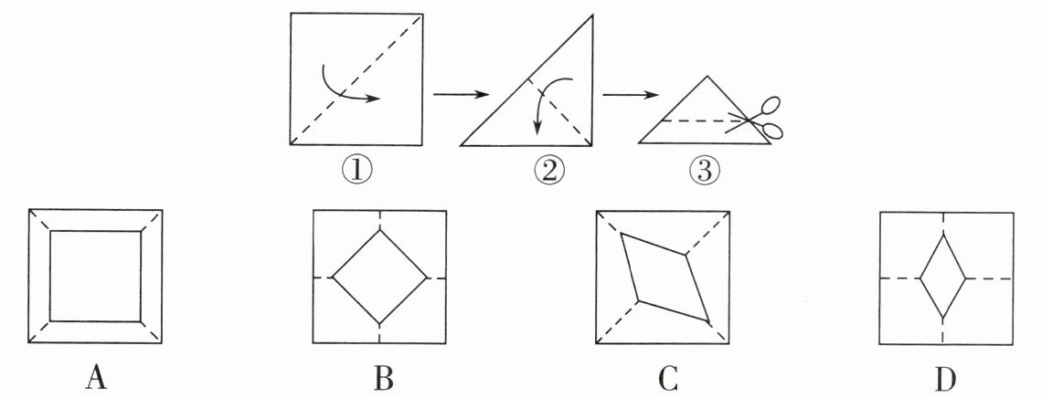 7. 将一张正方形纸片按如图步骤①②沿虚线对折两次,然后沿③中平行于底边的虚线剪去一个角,展开铺平后的图形是(