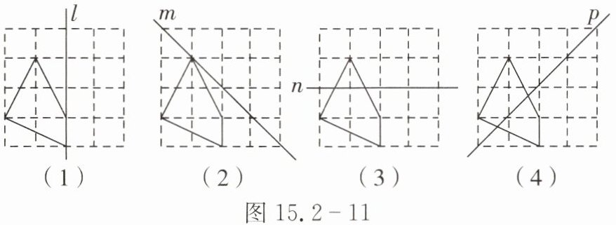11. 如图15.2-11,将已知四边形分别在网格图中补成以已知直线 $ l $,$ m $,$ n $,$ p $ 为对称轴的轴对称图形.