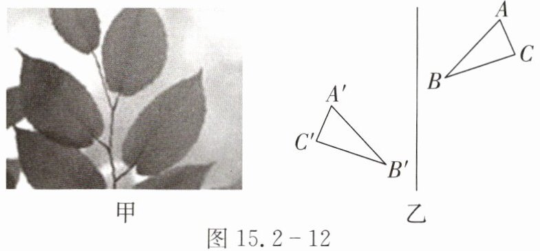 12. 把一个图形先沿着一条直线进行轴对称变换,再沿着与这条直线平行的方向平移,我们把这样的图形变换叫作滑动对称变换. 在自然界和日常生活中,大量地存在这种图形变换(如图15.2-12甲). 结合轴对称变换和平移变换的有关性质,你认为在滑动对称变换过程中,两个对应三角形(如图15.2-12乙)的对应点所具有的性质是(