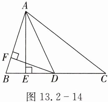 10. 如图 13.2 - 14,在△ABC 中,AD,AE 分别是 BC 边的中线,高线,过点 D 作 DF⊥AB 于点 F,若$\frac{AB}{BC}=\frac{2}{3}$,则$\frac{DF}{AE}$的值是(