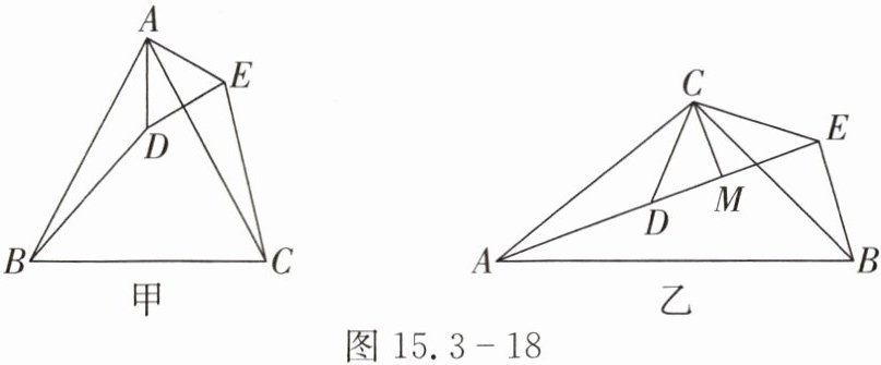 如图15.3-18乙,若$\triangle ACB$和$\triangle DCE$均为等腰直角三角形,$\angle ACB = \angle DCE = 90^{\circ}$,点$A$,$D$,$E$在同一条直线上,$CM$为$\triangle DCE$中$DE$边上的高,连接$BE$,请求$\angle AEB$的度数并判断线段$CM$,$AE$,$BE$之间的数量关系,说明理由.