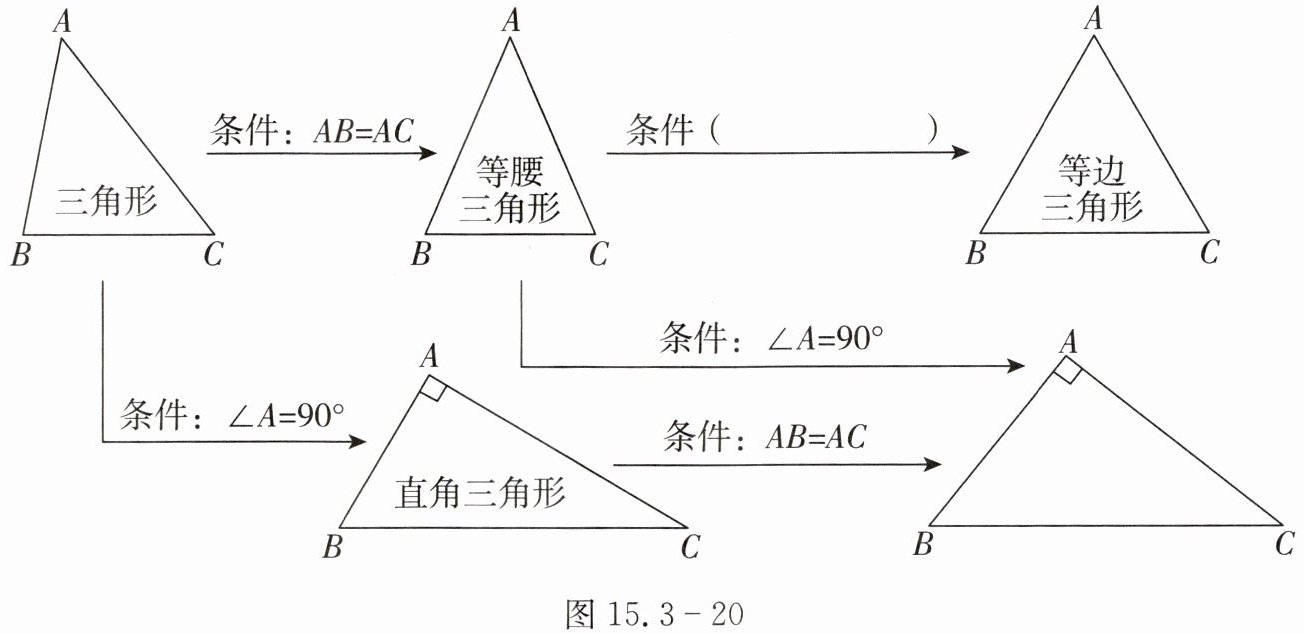 1. 小曹同学复习时将几种三角形的关系整理如图15.3-20,请帮他在括号内填上一个适当的条件.