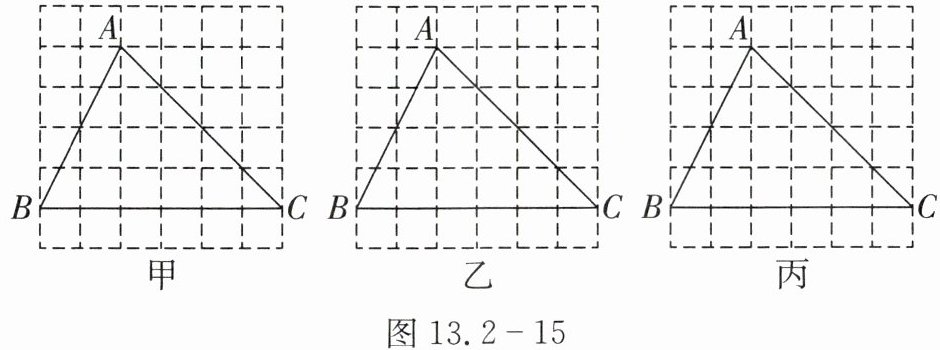 12. 如图 13.2 - 15,图甲,乙,丙均是 6×6 的正方形网格,每个小正方形的边长为 1,每个小正方形的顶点叫格点,图甲,乙,丙的△ABC 的顶点均在格点上. 只用无刻度的直尺,在给定的网格中,分别按下列要求画图,保留作图痕迹. 以下所画图形的顶点均在格点上.
