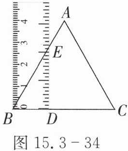 4. 小明在纸上画了一个边长为$5\ cm$的等边$\triangle ABC$,并将一个宽为$2\ cm$直尺如图15.3-34所示放在所画$\triangle ABC$上,使得直尺一条边与$\triangle ABC$的边$BC$重合,另一条边交边$AB$于点$E$,则$AE =$