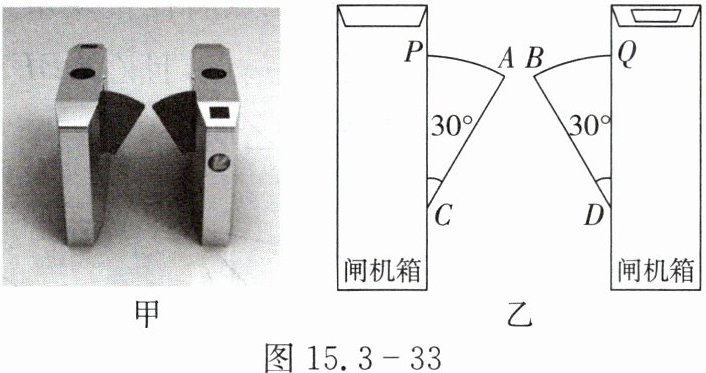 3. 如图15.3-33,图甲是一个地铁站入口的双翼闸机,图乙,它的双翼展开时,双翼边缘的端点$A$与$B$之间的距离为$12\ cm$,双翼的边缘$AC = BD = 64\ cm$,且与闸机侧立面夹角$\angle PCA = \angle BDQ = 30^{\circ}$. 当双翼收起时,可以通过闸机的物体的最大宽度为