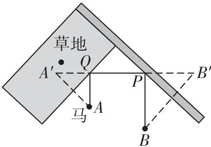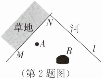 2. 如图,牧马人从 $ A $ 地出发,先到草地边某一处牧马,再到河边饮马,然后回到 $ B $ 处,请画出最短路径.