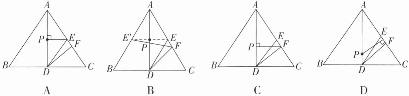 3. 在下列图中,在 $ \triangle ABC $ 中,$ AB = AC $,$ D $,$ E $ 分别为 $ BC $,$ AC $ 的中点,$ DF $ 平分 $ \angle ADC $ 交边 $ AC $ 于点 $ F $,$ P $ 为 $ AD $ 上一动点,若使得 $ PE + PF $ 的值最小,下列四个示意图中正确的是(