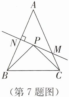 7. 如图,在 $ \triangle ABC $ 中,已知 $ AB = AC = 8 $,$ BC = 5 $,$ AB $ 的垂直平分线交 $ AB $ 于点 $ N $,交 $ AC $ 于点 $ M $,$ P $ 为直线 $ MN $ 上一点,连接 $ PB $,$ PC $,则 $ \triangle PBC $ 的周长最小值是