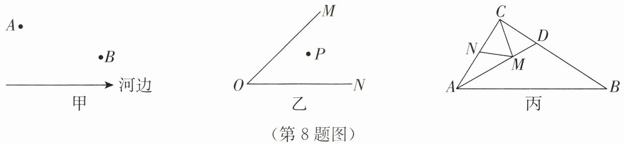 8. (1) 唐朝诗人李颀的诗《古从军行》开头两句:“白日登山望烽火,黄昏饮马傍交河”,诗中隐含着一个有趣的数学问题:如图甲所示,诗中大意是将军从山脚下的 $ A $ 点出发,带着马走到河边 $ P $ 点饮水后,再回到 $ B $ 点宿营,请问将军怎样走才能使总路程最短?请你通过画图,在图中找出 $ P $ 点,使 $ PA + PB $ 的值最小,不说明理由.