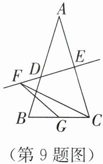 9. 如图,在 $ \triangle ABC $ 中,$ AB = AC $,$ BC = 5 $,$ \triangle ABC $ 的面积为 20,$ DE $ 垂直平分 $ AC $,分别交边 $ AB $,$ AC $ 于点 $ D $,$ E $,点 $ F $ 为直线 $ DE $ 上一动点,点 $ G $ 为 $ BC $ 的中点,连接 $ FG $,$ FC $,求 $ \triangle FGC $ 的周长的最小值.