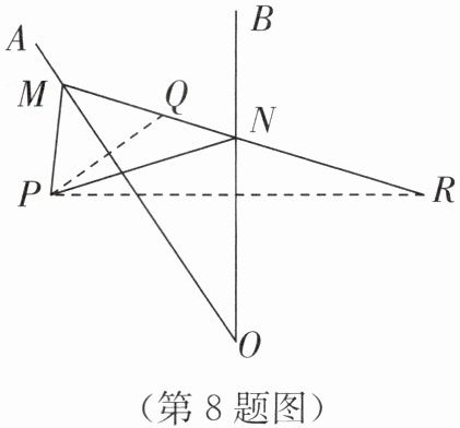 8. 如图,点$P$是$\angle AOB$外的一点,点$M$,$N$分别是$\angle AOB$两边上的点,点$P$关于$OA$的对称点$Q$恰好落在线段$MN$上,点$P$关于$OB$的对称点$R$落在$MN$的延长线上. 若$PM=8$,$PN=10$,$MN=13$,则线段$QR$的长为