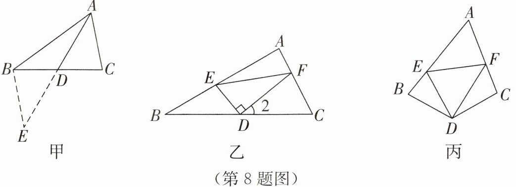 (1)如图乙,在 $ \triangle ABC $ 中,$ D $ 是 $ BC $ 边的中点,$ ED \perp DF $,$ DE $ 交 $ AB $ 于点 $ E $,$ DF $ 交 $ AC $ 于点 $ F $,连接 $ EF $. 求证:$ BE + CF > EF $.
