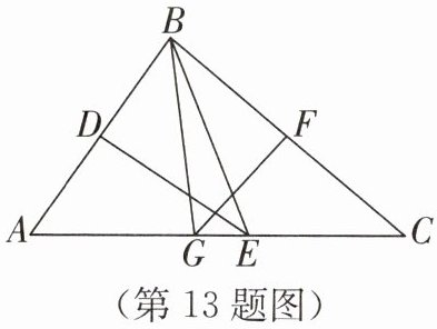 13. 如图,在 $ \triangle ABC $ 中,$ AB $ 边的中垂线 $ DE $,分别与 $ AB $,$ AC $ 边交于点 $ D $,$ E $ 两点,$ BC $ 边的中垂线 $ FG $,分别与 $ BC $,$ AC $ 边交于点 $ F $,$ G $ 两点,连接 $ BE $,$ BG $。若 $ \triangle BEG $ 的周长为 $ 16 $,$ GE = 1 $。则 $ AC $ 的长为