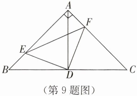 9. 如图,在△ABC中,∠BAC=90°,AB=AC=6 cm,D为BC中点,E,F分别是AB,AC两边上的动点,且∠EDF=90°,下列结论:①BE=AF;②EF的长度不变;③∠BED+∠CFD的度数不变;④四边形AEDF的面积为9 cm². 其中正确结论的个数是(