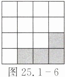 9.如图25.1-6,已有4个小正方形被涂黑,若再涂黑任意1个白色的小正方形(每个白色小正方形被涂黑的可能性相同),使新构成的黑色部分是轴对称图形的概率是