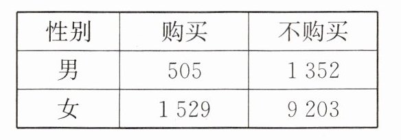 (2)因为$\frac{505}{505 + 1352} ≈ 0.27,$$\frac{1529}{1529 + 9203} ≈ 0.14,$所以男性购买商品的可能性较大.