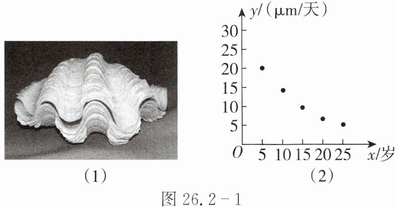 如图 26.2-1(1),砗磲(chēqú)是地球上最大的双壳类动物,某海洋研究院对南海的砗磲样本进行分析,得到某砗磲样本年龄$x$(单位:岁)与平均日生长速率$y$(单位:$\mu m/$天)的数据如下表:
