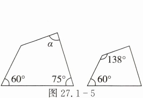 8. 如图 27.1-5 所示的两个四边形相似,则$\angle \alpha$的度数是(