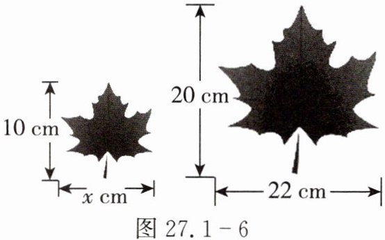 9. 秋天红透的枫叶,总能牵动人们无尽的思绪,所以诗人杜牧说:“停车坐爱枫林晚,霜叶红于二月花”. 如图 27.1-6 是两片形状相同的枫叶图案,则$x$的值为