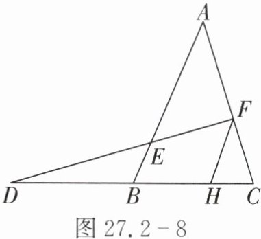 9. 如图 27.2 - 8,在$\triangle ABC$中,延长$CB$至点$D$,使$BD = BC$,在$AC$上取一点$F$,连接$DF$交$AB$于点$E$,过$F$点作$FH // AB$交$CD$于点$H$,已知$AC = DE = 3$,$EF = 2$.