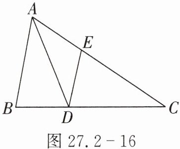 5. 如图 27.2 - 16,在$\triangle ABC$中,$\angle BAC$的平分线交$BC$于点$D$,过点$D$作$AB$的平行线交$AC$于点$E$,若$\angle BAD = \angle C$,则图中的相似三角形共有(