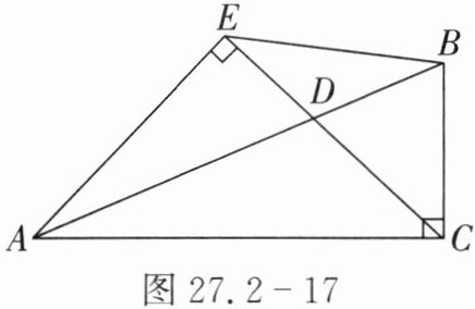 6. 如图 27.2 - 17,在$ Rt \triangle ABC$中,$\angle ACB = 90°$,点$D$是边$AB$上一点,连接$CD$,$CD = CB$,过点$A$作$CD$的垂线,交$CD$的延长线于点$E$,求证:$\triangle ADE \sim \triangle ABC$.