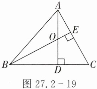8. 如图 27.2 - 19,$\triangle ABC$的高$AD$,$BE$相交于点$O$,写出一个与$\triangle AOE$相似的三角形,这个三角形可以是