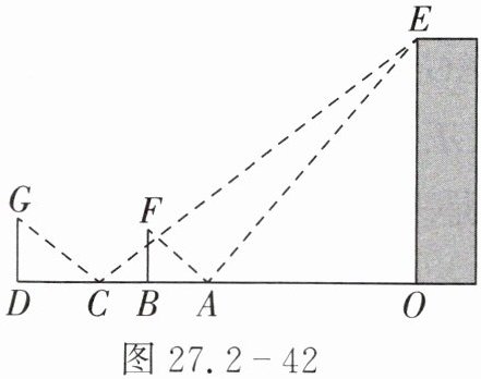 8. 如图 27.2 - 42,为了测量一栋楼的高度$OE$,小明同学先在操场上$A$处放一面镜子,向后退到$B$处,恰好在镜子中看到楼的顶部$E$;再将镜子放到$C$处,然后后退到$D$处,恰好再次在镜子中看到楼的顶部$E$($O$,$A$,$B$,$C$,$D$在同一条直线上),测得$AC = 2\ m$,$BD = 2.1\ m$,如果小明眼睛距地面高度$BF$,$DG$为$1.6\ m$,试确定楼的高度$OE$.