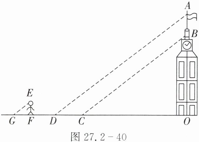 6. 小明和小华利用阳光下的影子来测量一建筑物顶部旗杆的高. 如图 27.2 - 40所示. 在某一时刻,他们在阳光下,分别测得该建筑物$OB$的影长$OC$为$16$米,$OA$的影长$OD$为$20$米,小明的影长$FG$为$2.4$米,其中$O$,$C$,$D$,$F$,$G$五点在同一直线上,$A$,$B$,$O$三点在同一直线上,且$AO \perp OD$,$EF \perp FG$. 已知小明的身高$EF$为$1.8$米,求旗杆的高$AB$.