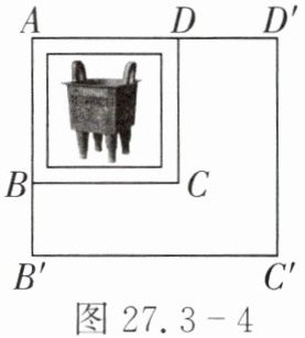 5. 如图27.3-4,某历史博物馆以“青铜文化”为主题,设计了一款边长为$2\ cm$的正方形文创纪念徽章$ABCD$.为满足不同展示需求,现需制作放大版纪念徽章$AB^{\prime}C^{\prime}D^{\prime}$.若以顶点$A$为位似中心进行位似变换,对应边的比$AB:AB^{\prime}=3:5$,则纪念徽章$AB^{\prime}C^{\prime}D^{\prime}$的面积是(