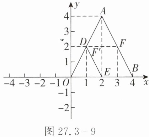 1. 如图27.3-9,在平面直角坐标系中,DE// AB,A,,D,,B,,E,$,\triangle ODE$与$\triangle OAB$的位似比为.若点F的坐标为(3,2),则点F在$\triangle ODE$中的对应点$F^{\prime}$的坐标为.