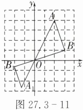 4. 如图27.3-11,在平面直角坐标系中,每个小方格都是边长为1个单位长度的正方形.已知$\triangle AOB$与$\triangle A_{1}OB_{1}$位似,位似中心为原点$O$,且相似比为$3:2$,点$A$,$B$都在格点上,则点$B_{1}$的坐标为