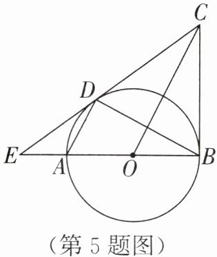 5. 如图,$AB$为$\odot O$的直径,$BC$为$\odot O$的切线,弦$AD// OC$,直线$CD$交$BA$的延长线于点$E$,连接$BD$.给出下列结论:①$CD$是$\odot O$的切线;②$CO\perp DB$;③$\bigtriangleup EDA\backsim \bigtriangleup EBD$;④$ED· BC=BO· BE$.其中正确结论的个数有(