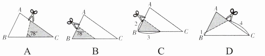 4. 如图,在$\bigtriangleup ABC$中,$\angle A=78^{\circ}$,$AB=4$,$AC=6$.若将$\bigtriangleup ABC$沿图中的虚线剪开,则剪下的阴影三角形与原三角形不相似的是(