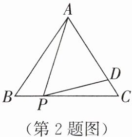 2. 如图,在等边三角形$ABC$中,$P$为$BC$上一点,$D$为$AC$上一点,且$\angle APD=$$60^{\circ}$,$BP=1$,$CD=\frac{2}{3}$,则$\bigtriangleup ABC$的边长为(