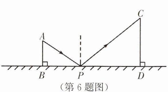6. 如图,小明设计用手电筒来测量某古城墙的高度,在点$P$处放一水平的平面镜,光线从点$A$出发,经平面镜反射后,刚好射到古城墙$CD$的顶端$C$处.已知$AB\perp BD$,$CD\perp BD$,并且测得$AB=1.2\ m$,$BP=1.8\ m$,$PD=12\ m$,则该古城墙的高度是