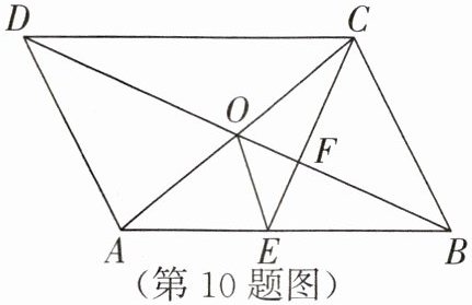 10. 如图,$□ ABCD$的对角线$AC$,$BD$交于点$O$,$CE$平分$\angle BCD$,交$AB$于点$E$,交$BD$于点$F$,且$\angle ABC=60^{\circ}$,$AB=2BC$,连接$OE$.给出下列结论:①$EO\perp AC$;②$S_{\bigtriangleup AOD}=4S_{\bigtriangleup OCF}$;③$AC:BD=\sqrt{21}:7$;④$FB^{2}=OF· DF$.其中正确的结论有