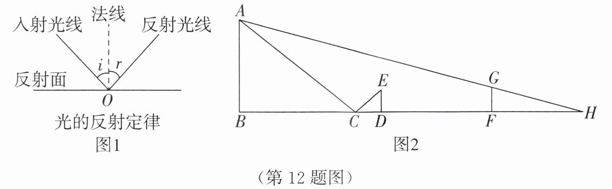 12. (10分)[学科融合]如图1,在反射现象中,反射光线,入射光线和法线都在同一个平面内;反射光线和入射光线分别位于法线两侧;反射角$r$等于入射角$i$.这就是光的反射定律.