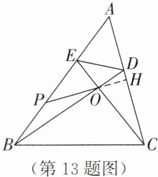 13. (12分)如图,在$\bigtriangleup ABC$中,$D$,$E$分别为$AC$,$AB$上两点,满足$\angle A+\angle ABD+\angle ACE=90^{\circ}$,$P$为$BE$的中点,且$OP\perp AC$.
