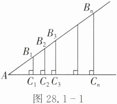 3. 如图 28.1 - 1,从 $ \angle A $ 的一条边向另一条边作垂线,形成众多直角三角形,虽然这些三角形的大小不一,但是每个三角形中 $ \angle A $ 的对边与斜边的比值
