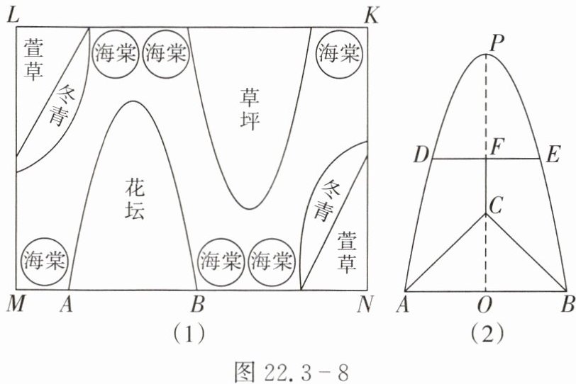 9. 如图 22.3 - 8(1)中,矩形 $ MNKL $ 是学校花园的示意图,其中一个花坛的轮廓可近似看成由抛物线的一部分与线段 $ AB $ 组成的封闭图形,点 $ A $,$ B $ 在矩形的边 $ MN $ 上。现要对该花坛内种植区域进行划分,以种植不同花卉,学校面向全体同学征集设计方案。