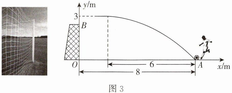 8. 一次足球训练中,小明从球门正前方$8m$的A处射门,球射向球门的路线呈抛物线.当球飞行的水平距离为$6m$时,球达到最高点,此时球离地面$3m$.已知球门高$OB$为$2.44m$,现以$O$为原点建立如图3所示直角坐标系.