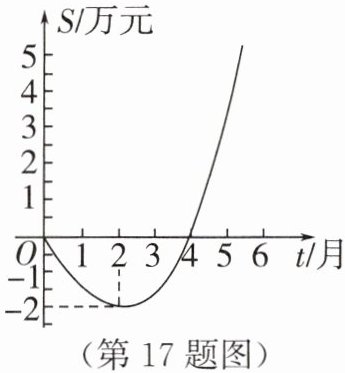 17. (13分)A公司推出一种高效环保洗涤用品,年初上市后,公司经历了从亏损到盈利的过程,下面的二次函数图象刻画了该公司年初以来累积利润$S$(单位:万元)与销售时间$t$(单位:月)之间的关系(即前$t$个月的利润总和$S$与$t$之间的关系).