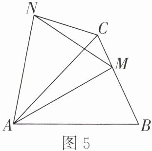 7. 如图5,在$\bigtriangleup ABC$中,$AB = AC$,若$M$是$BC$边上任意一点,将$\bigtriangleup ABM$绕点$A$逆时针旋转得到$\bigtriangleup ACN$,点$M$的对应点为点$N$,连接$MN$,则下列结论一定正确的是(
