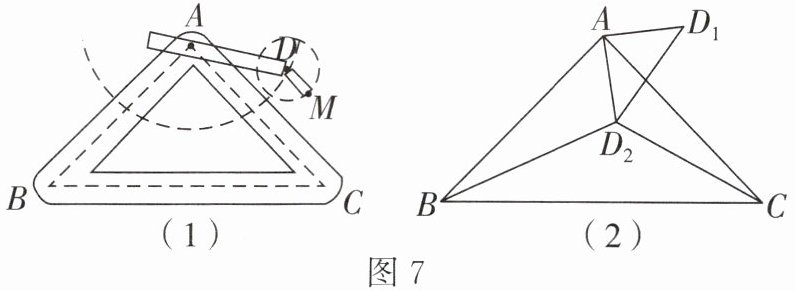 (2)若摆动臂$AD$顺时针旋转$90^{\circ}$,点$D$的位置由$\bigtriangleup ABC$外的点$D_{1}$转到其内的点$D_{2}$处,连接$D_{1}D_{2}$,如图7(2),此时$\angle AD_{2}C = 135^{\circ},CD_{2} = 60$,求$BD_{2}$的长.