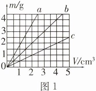 2. 小明通过实验得到了 $a$、$b$、$c$ 三个实心体的 $m-V$ 图像如图 1 所示,分析图像可知